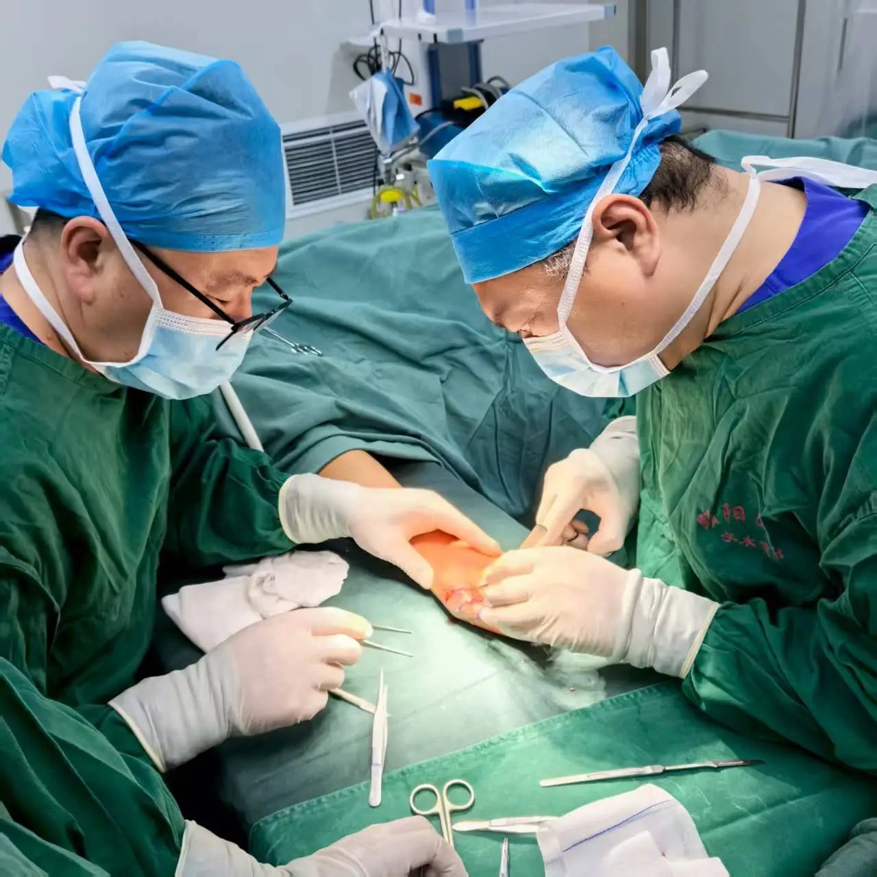 手术过程顺利,在栗鹏程教授的全程指导下,颐阳医院手足外科团队依托显微外科技术,为小瑞开展了手部畸形矫治手术: