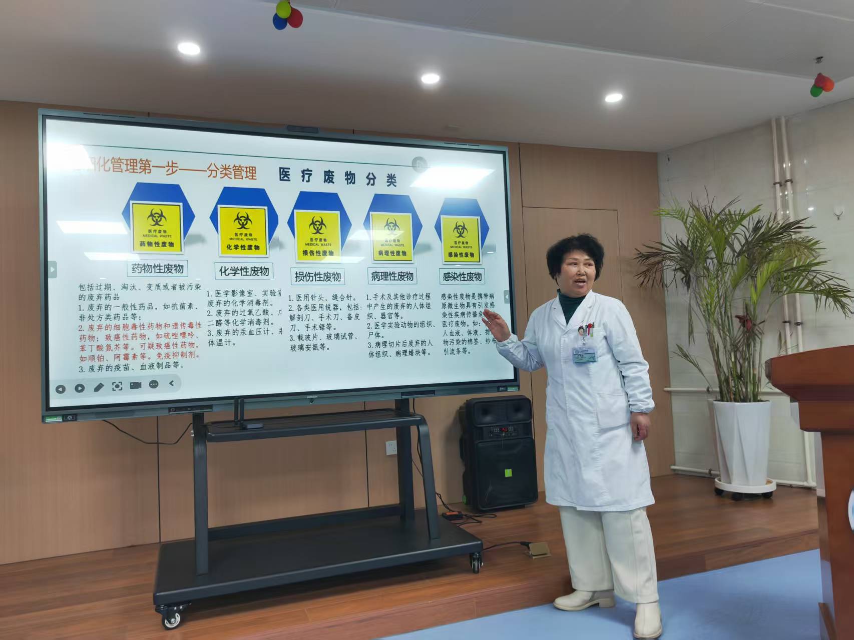 下半场由郭老师主讲《医疗废物处置与管理》。她系统解读了医疗废物的分类标准、收集规范、封扎要求和转运流程,结合最新管理规范与实际案例,重点强调了医疗废物处置中的感染防控要点与责任分工。郭老师特别指出,规范处理医疗废物是防止院内交叉感染、保障医务人员和患者安全的重要环节,全院职工必须强化责任意识,严格落实各项操作规程。她现场演示了医疗废物封扎的正确方法,并发出“人人参与、共筑安全”的行动倡议,要求各科室建立常态化自查机制,确保医疗废物管理全流程安全可控。